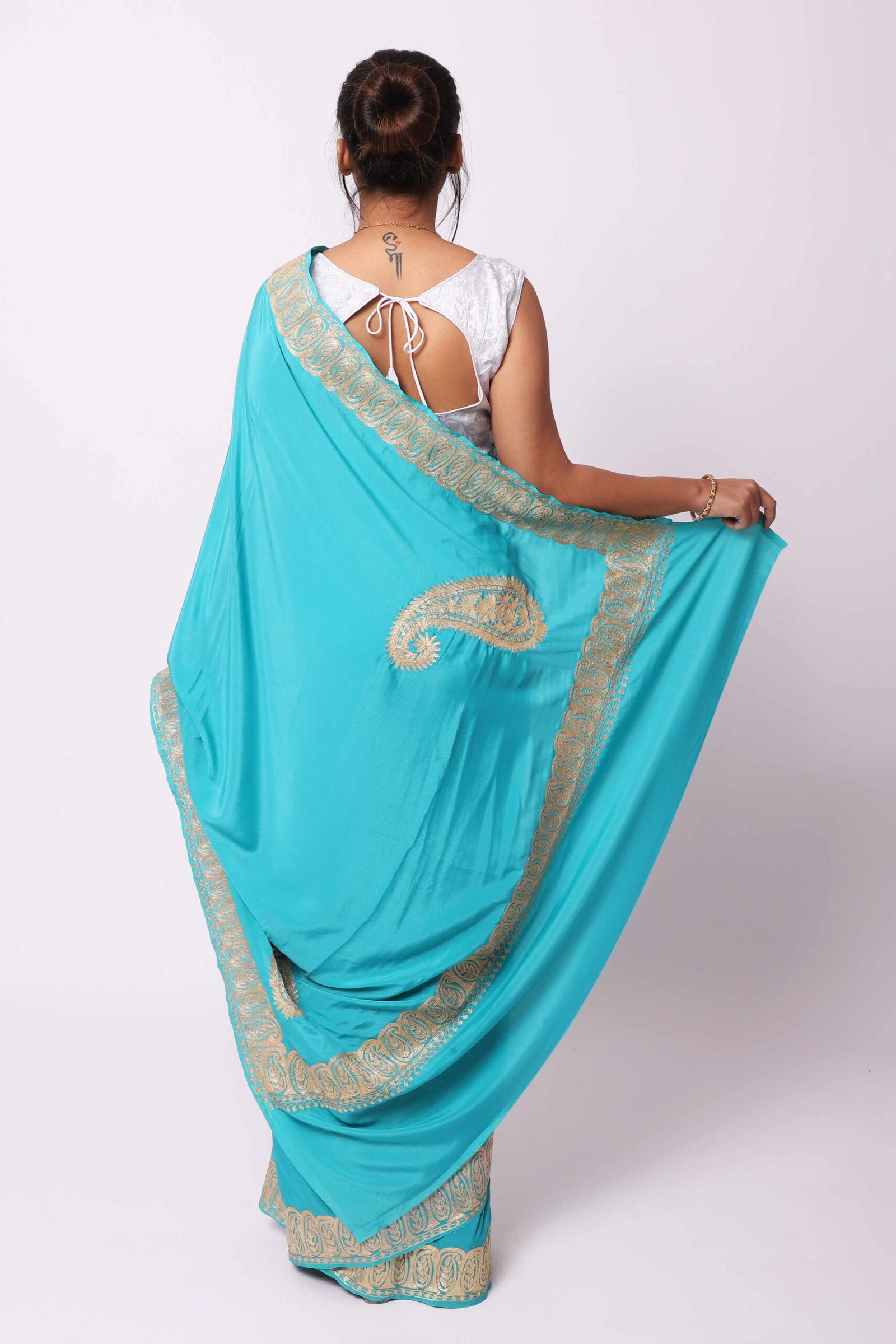 “Saree With Puff Tilla Work Drawen Big Border And Long Pasley On Palla Attached With Embrodrieded Blouse.