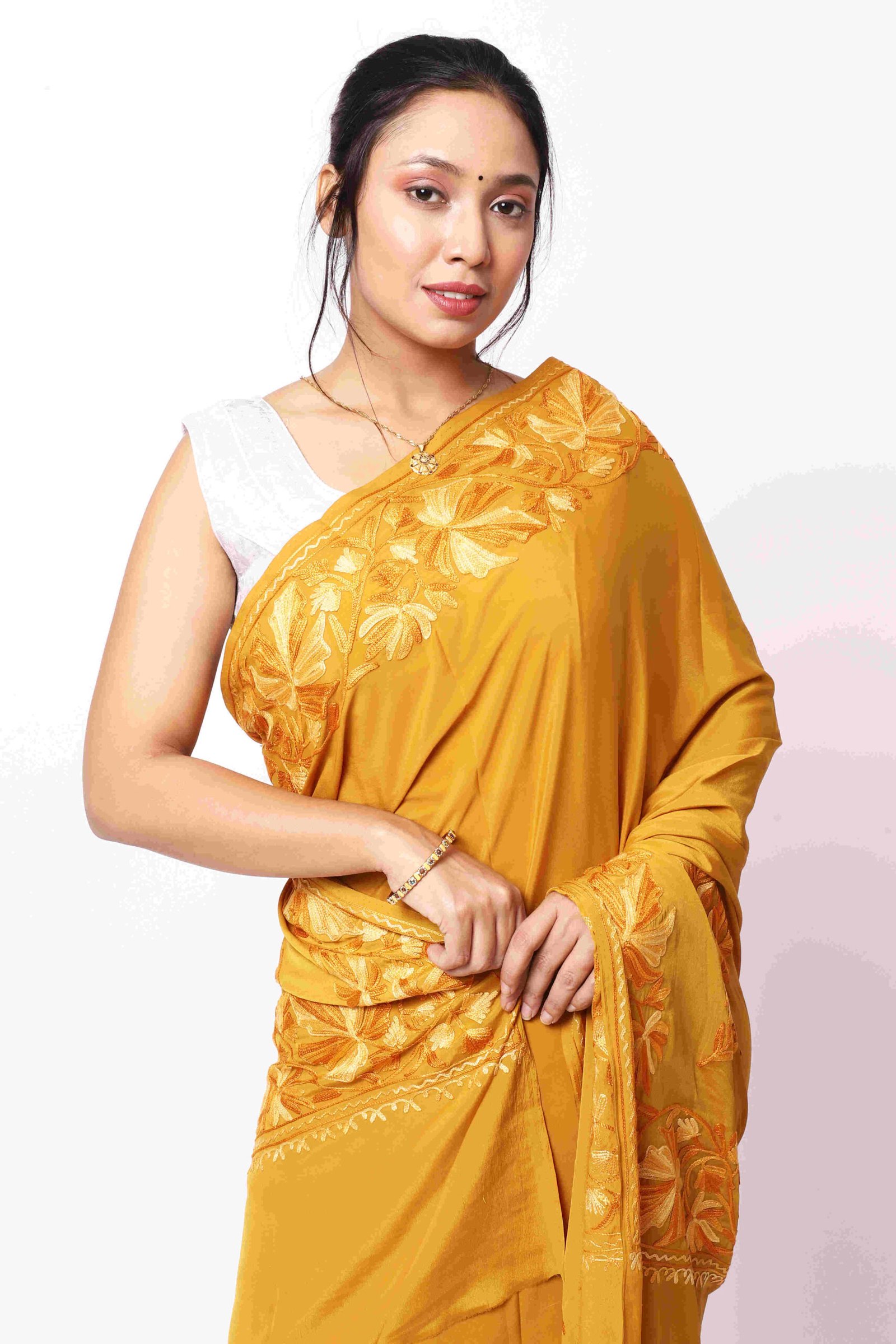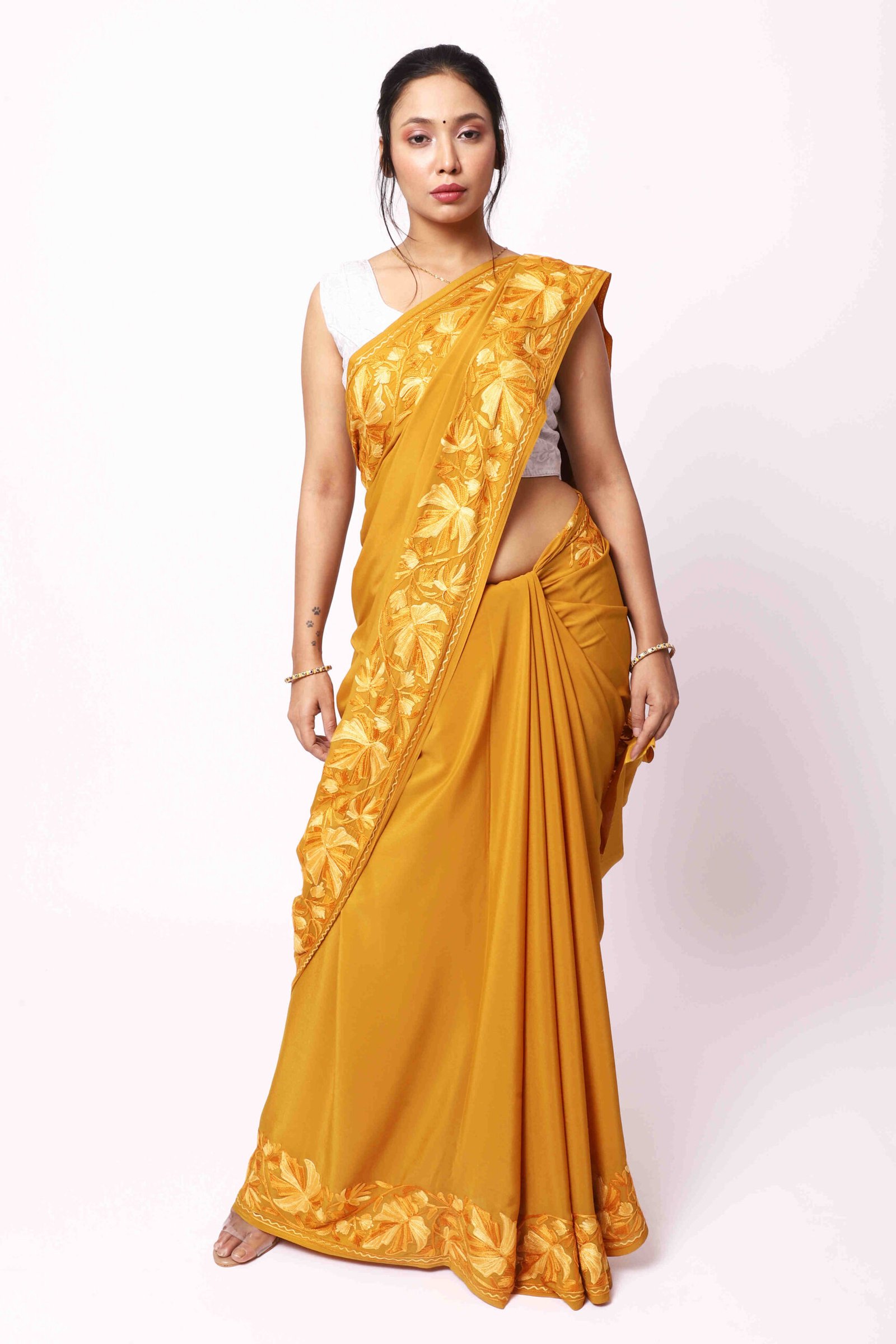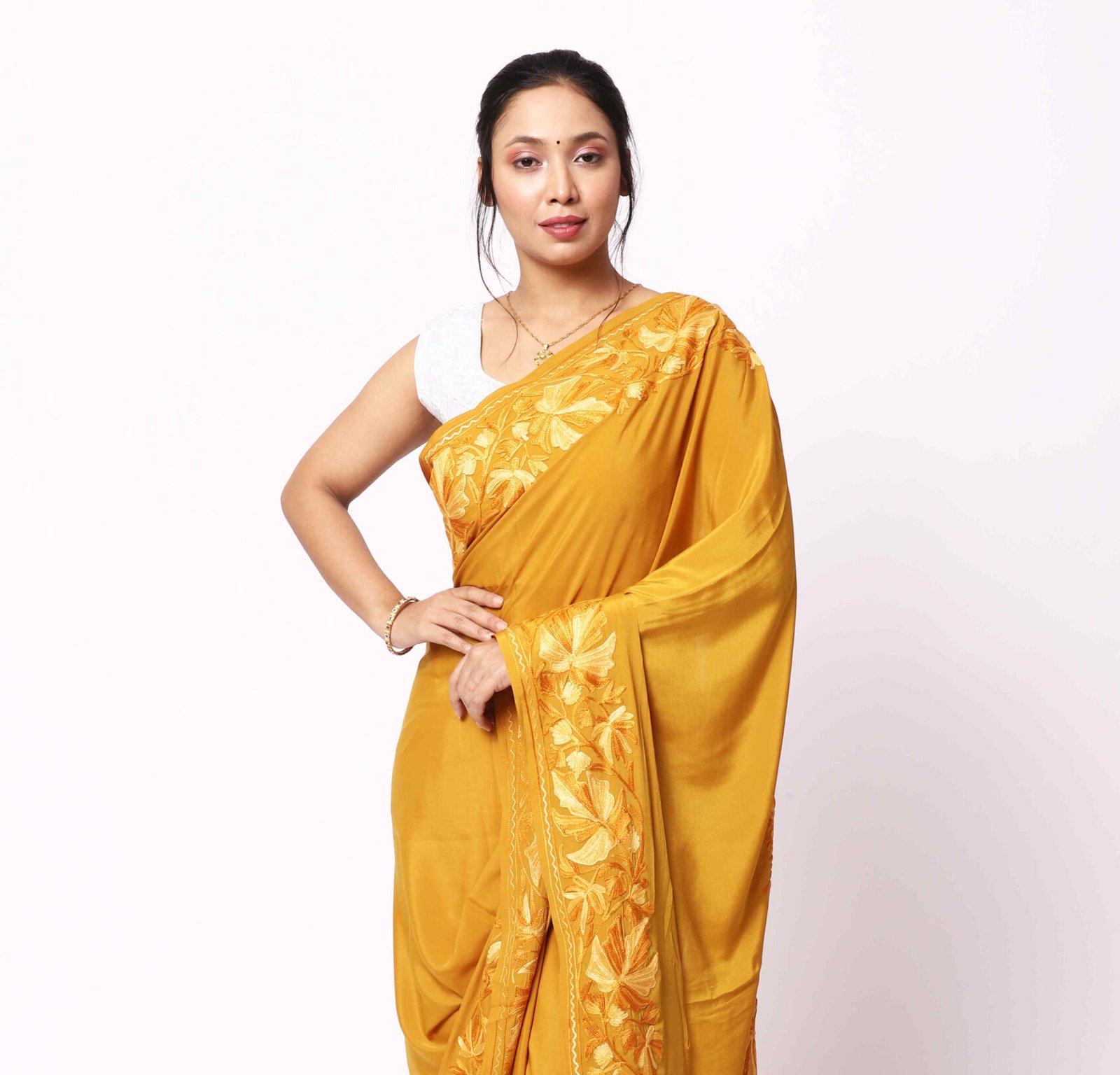 “Saree With Aree Work Border With Motives On The Palla Attached With Embrodrieded Blouse.