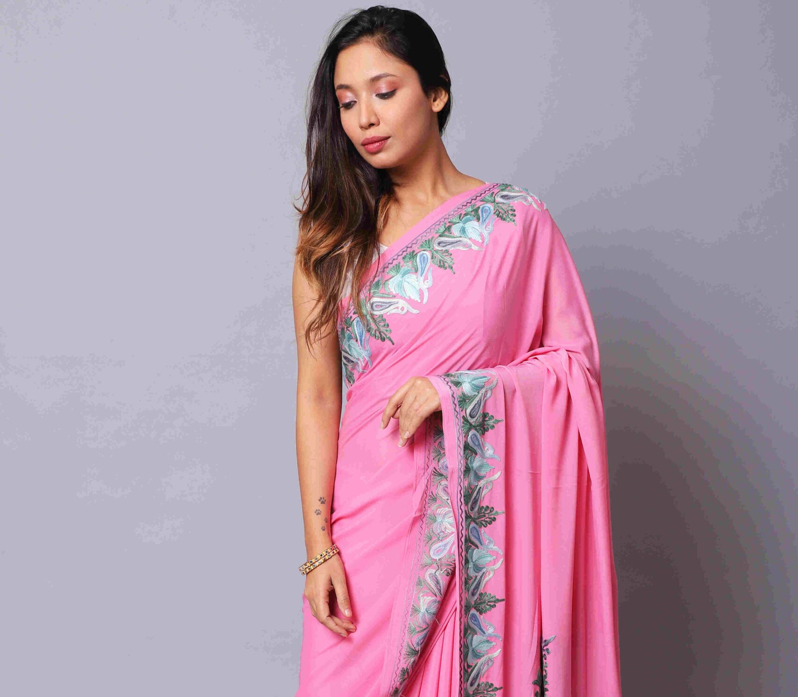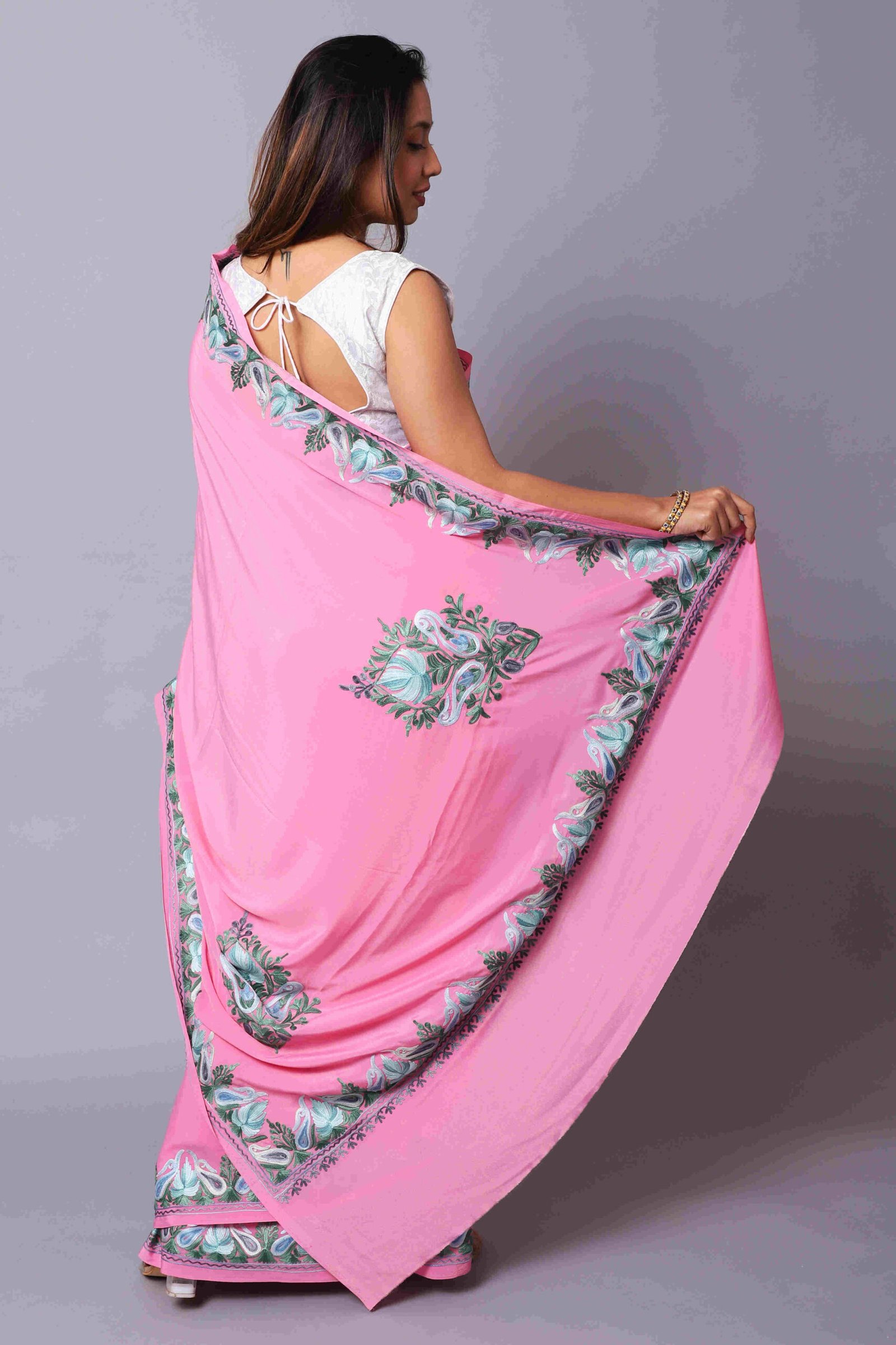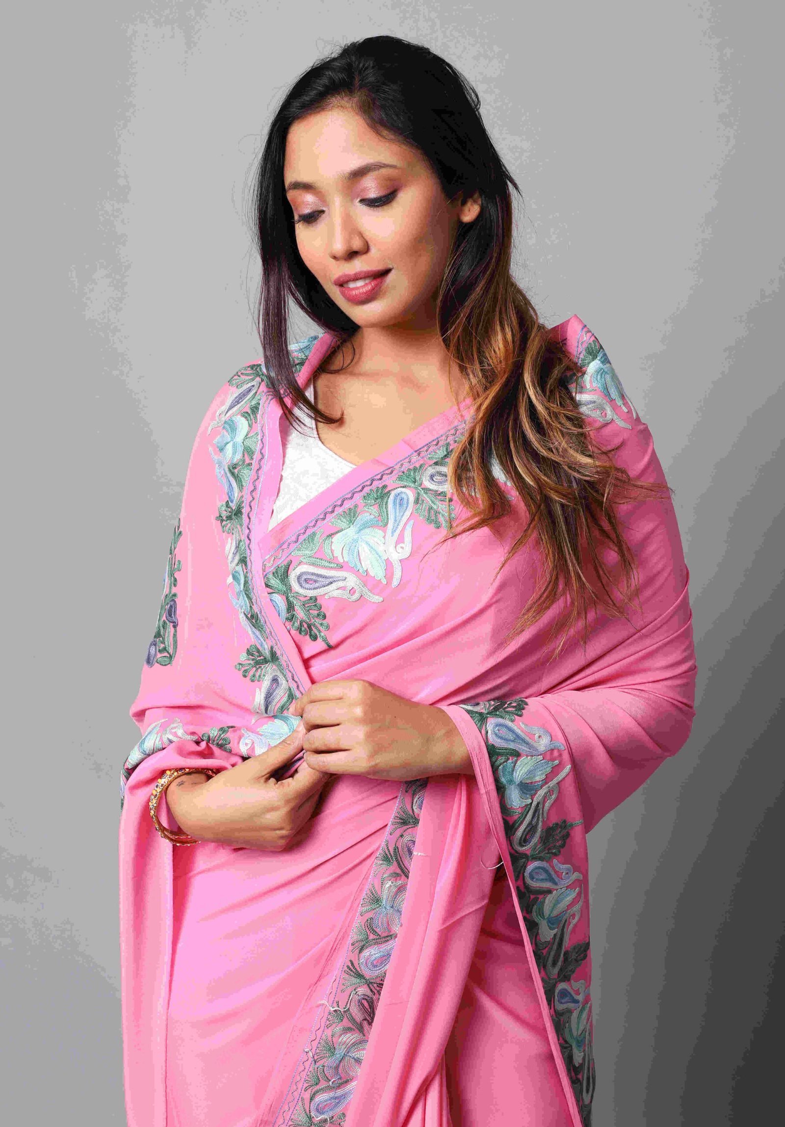 “Saree With Aree Work Border With Motives On The Palla Attached With Embrodrieded Blouse.