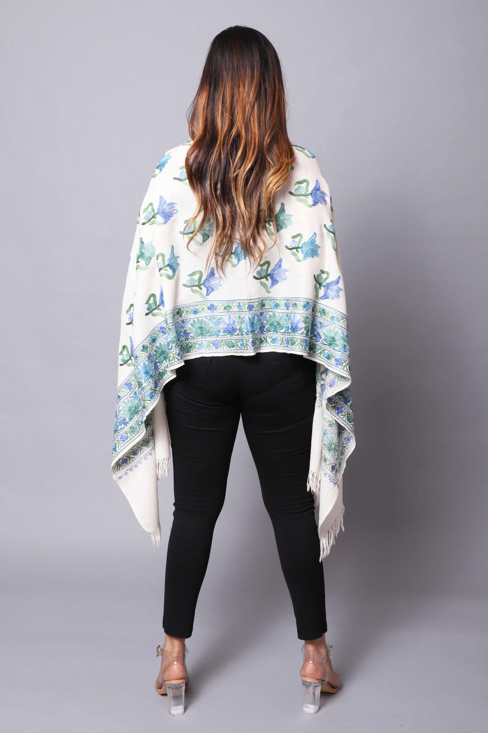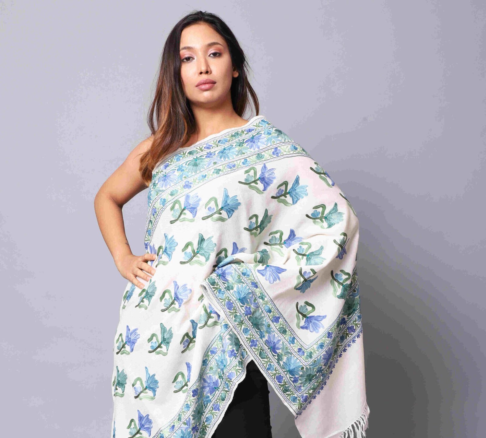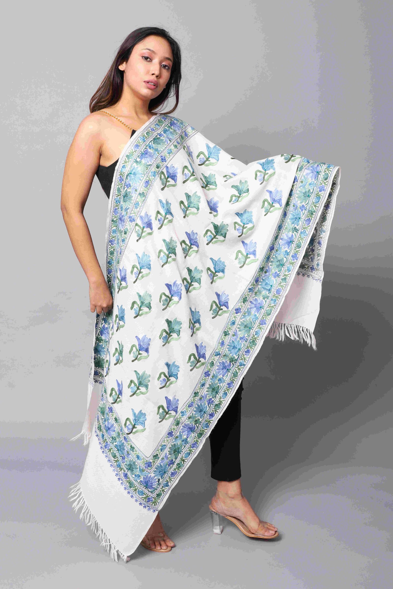 SEMI PASHMINA AREE WORK STOLE WITH FINE AREE JAMA WORK DESIGN ALL OVER THE STOLE.